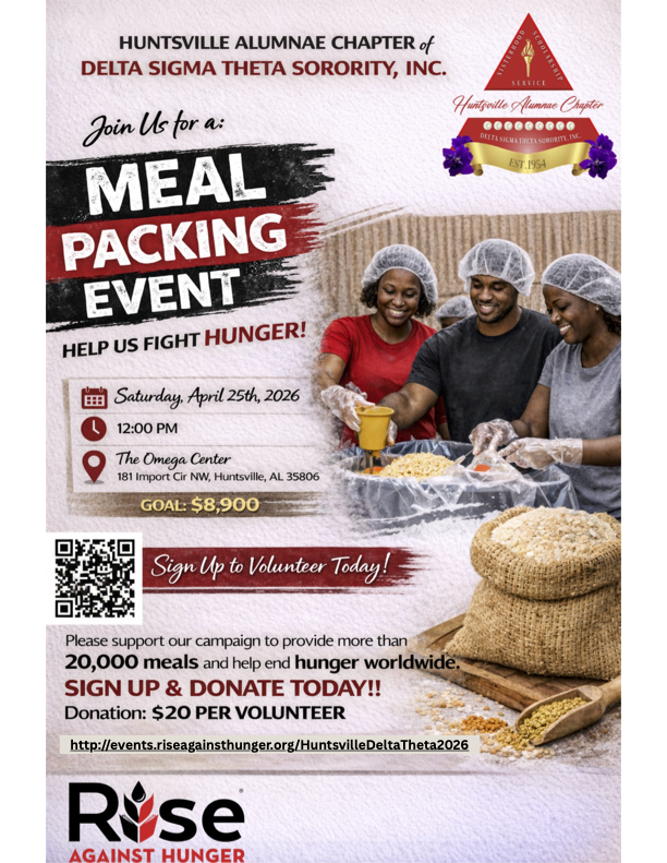 Sign up for the Annual Rise Against Hunger Meal Packing Event taking place on Saturday, April 25, 2026 from 12-2pm at The Omega Center (181 Import Circle Huntsville, AL 35806). This event is open to the public, so please encourage your family, friends, and co-workers to donate and sign-up to volunteer. Each volunteer and Soror is asked to donate $20 to our campaign.